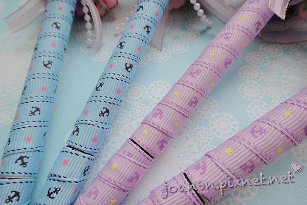 紫色的筆桿用的是粉紅珠鍊,藍色筆桿用的是白色珠鍊
