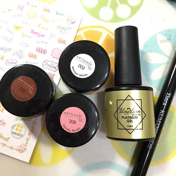 三罐色膠是hello nail的artgenic 208、220、002 →大推002白超顯色滑順!!