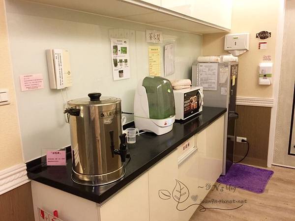 有飲水機、微波爐、蒸氣消毒鍋、每日茶飲