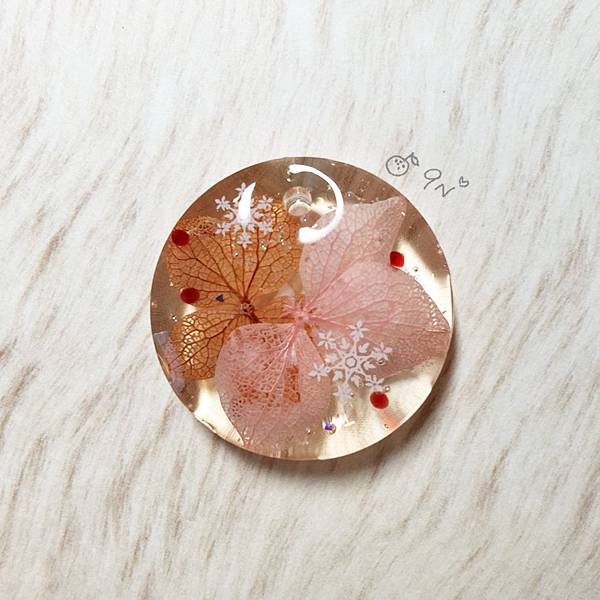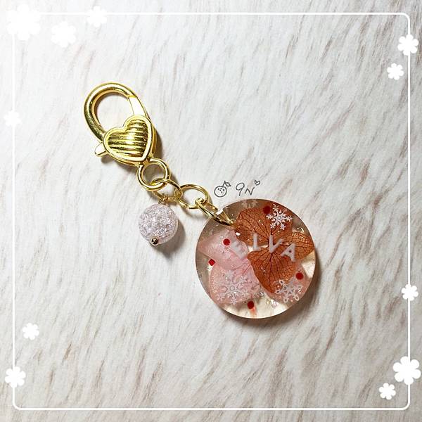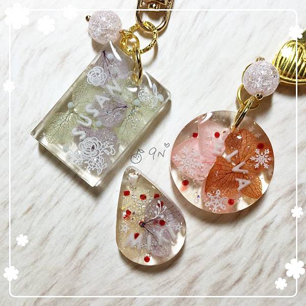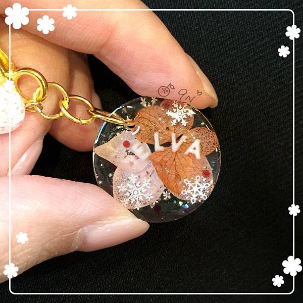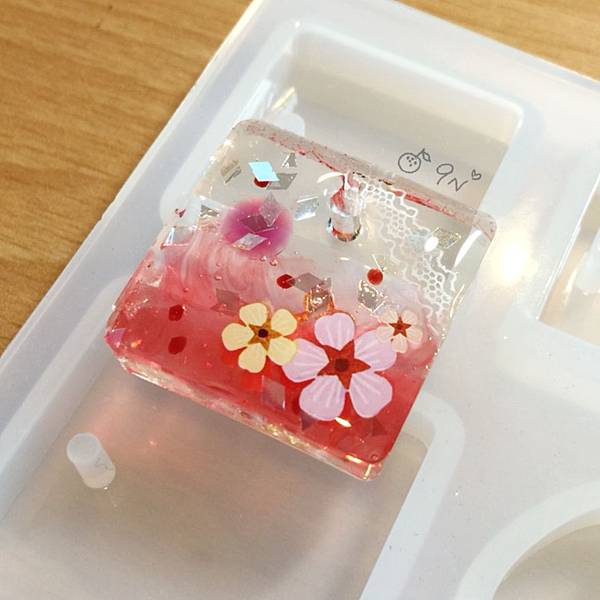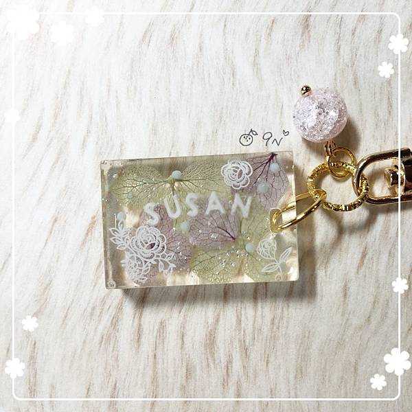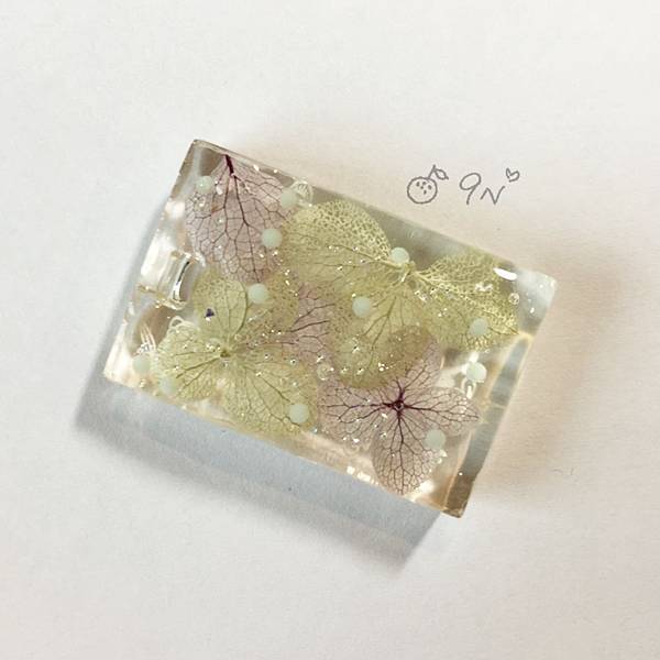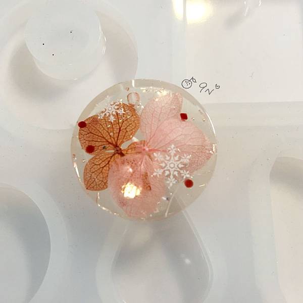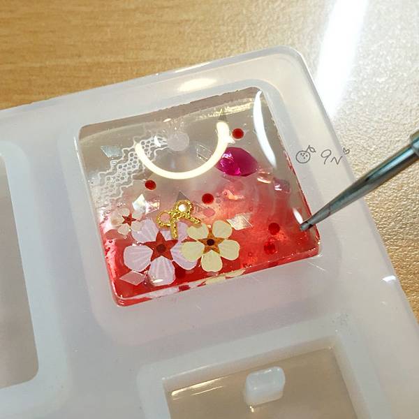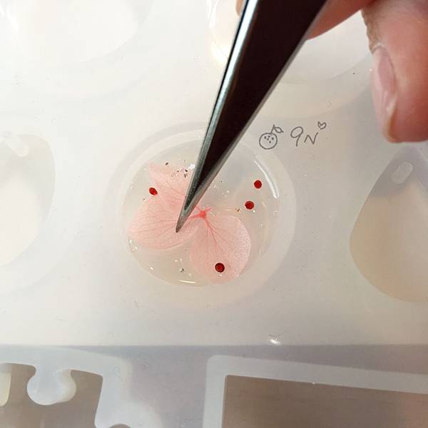 底層灌膠後,鋪上紫陽花和施華洛世奇水晶砂