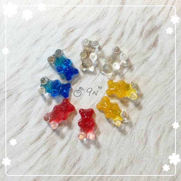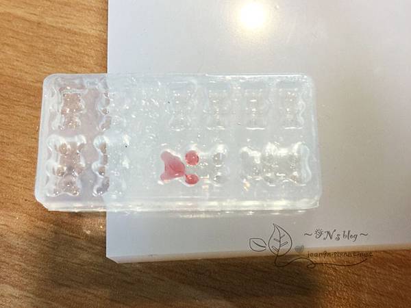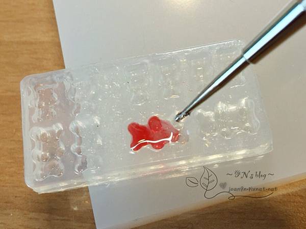 小熊頭的部份是用紅色,腳是透明,中間交會處讓膠自行流動,慢慢疊上去就會有漸層的感覺~