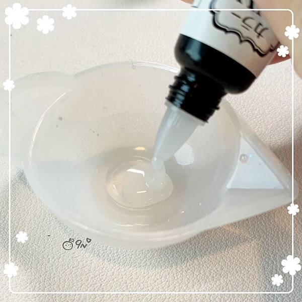 接著拿出透明膠先擠一點到調色杯裡,再擠入白色膠